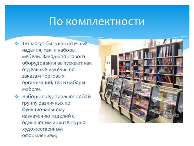 Заводы торгового оборудования выпускают как отдельные изделия по заказам торговых организаций, так и наборы мебели.
