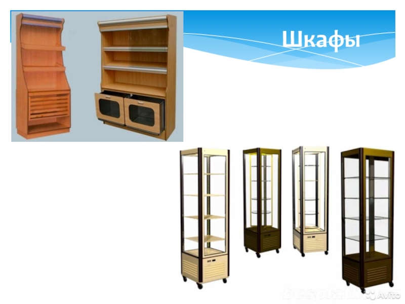 оснащаются полками, корзинами, подшкафниками и другими конструктивными элементами с учетом ассортимента продаваемых товаров и метода их продажи.