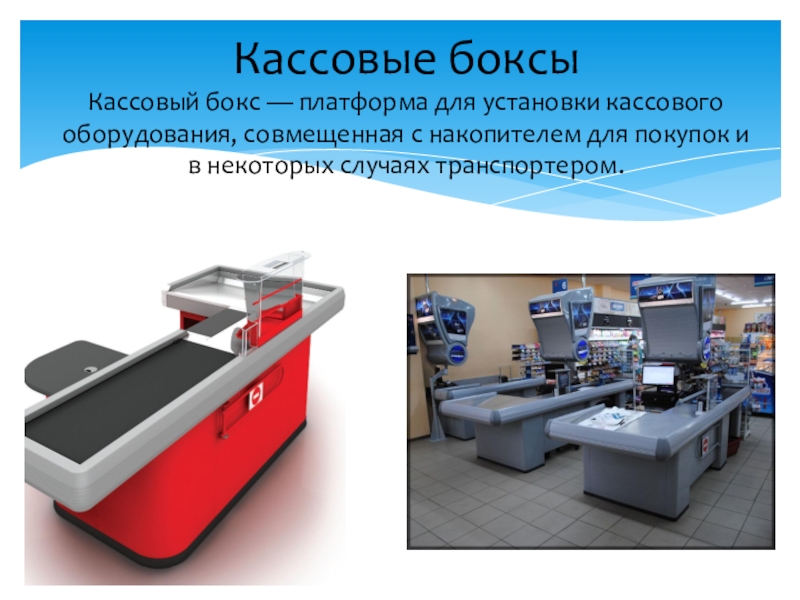 для оборудования рабочего места кассира в магазине самообслуживания и являются обязательным компонентом современного магазина. Этот вид кассового оборудования оснащен транспортирной лентой, это облегчает работу кассира, так как по транспортиру товар движется к продавцу.