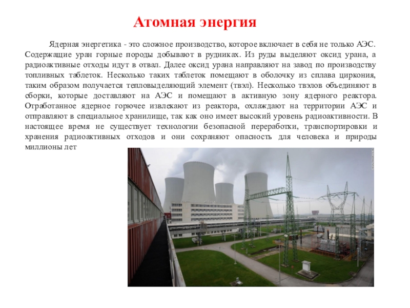 не только АЭС. Содержащие уран горные породы добывают в рудниках. Из руды выделяют оксид урана, а радиоактивные отходы идут в отвал. Далее оксид урана направляют на завод по производству топливных таблеток. Несколько таких таблеток помещают в оболочку из сплава циркония, таким образом получается тепловыделяющий элемент (твэл). Несколько твэлов объединяют в сборки, которые доставляют на АЭС и помещают в активную зону ядерного реактора. Отработанное ядерное горючее извлекают из реактора, охлаждают на территории АЭС и отправляют в специальное хранилище, так как оно имеет высокий уровень радиоактивности. В настоящее время не существует технологии безопасной переработки, транспортировки и хранения радиоактивных отходов и они сохраняют опасность для человека и природы миллионы лет