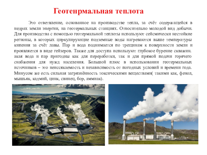 недрах земли энергии, на геотермальных станциях. Относительно молодой вид добычи. Для производства с помощью геотермальной теплоты используют сейсмически нестойкие регионы, в которых циркулирующие подземные воды нагреваются выше температуры кипения за счёт лавы. Пар и вода поднимается по трещинам к поверхности земли и проявляется в виде гейзеров. Также для доступа используют глубокое бурение скважин. акая вода и пар пригодны как для переработки, так и для прямой подачи горячего снабжения для нужд населения. Большой плюс в использовании геотермальных источников – это неиссякаемость и независимость от погодных условий и времени года. Минусом же есть сильная загрязнённость токсическими веществами( такими как, фенол, мышьяк, кадмий, цинк, свинец, бор, аммиак).
