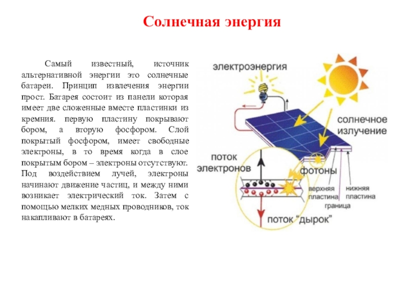 энергии прост. Батарея состоит из панели которая имеет две сложенные вместе пластинки из кремния. первую пластину покрывают бором, а вторую фосфором. Слой покрытый фосфором, имеет свободные электроны, в то время когда в слое покрытым бором – электроны отсутствуют. Под воздействием лучей, электроны начинают движение частиц, и между ними возникает электрический ток. Затем с помощью мелких медных проводников, ток накапливают в батареях.