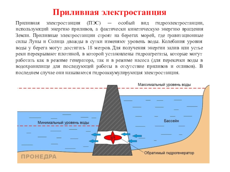 а фактически кинетическую энергию вращения Земли. Приливные электростанции строят на берегах морей, где гравитационные силы Луны и Солнца дважды в сутки изменяют уровень воды. Колебания уровня воды у берега могут достигать 18 метров. Для получения энергии залив или устье реки перекрывают плотиной, в которой установлены гидроагрегаты, которые могут работать как в режиме генератора, так и в режиме насоса (для перекачки воды в водохранилище для последующей работы в отсутствие приливов и отливов). В последнем случае они называются гидроаккумулирующая электростанция.