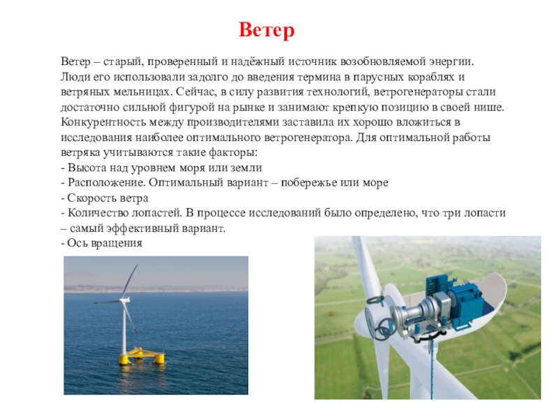 использовали задолго до введения термина в парусных кораблях и ветряных мельницах. Сейчас, в силу развития технологий, ветрогенераторы стали достаточно сильной фигурой на рынке и занимают крепкую позицию в своей нише. Конкурентность между производителями заставила их хорошо вложиться в исследования наиболее оптимального ветрогенератора. Для оптимальной работы ветряка учитываются такие факторы: