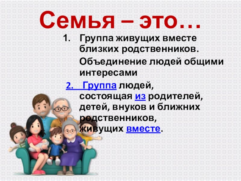 Семья – это…Группа живущих вместе близких родственников.    Объединение людей общими интересами2.  Группа людей, состоящая из родителей, детей,