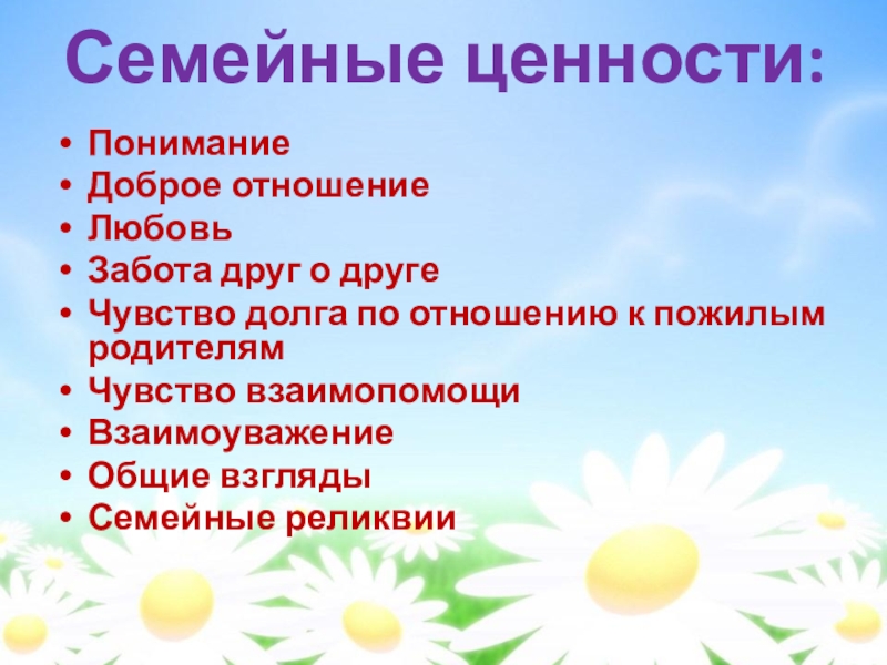 Семейные ценности:ПониманиеДоброе отношениеЛюбовьЗабота друг о другеЧувство долга по отношению к пожилым родителямЧувство взаимопомощиВзаимоуважениеОбщие взглядыСемейные реликвии