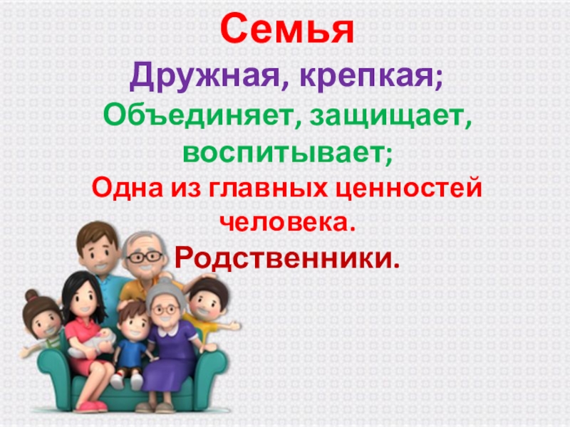 Семья Дружная, крепкая; Объединяет, защищает, воспитывает; Одна из главных ценностей человека. Родственники.