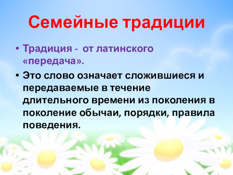 Семейные традицииТрадиция - от латинского «передача».Это слово означает сложившиеся и передаваемые в течение длительного времени из поколения