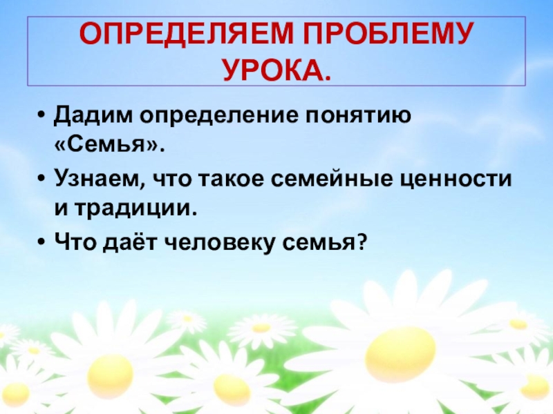 ОПРЕДЕЛЯЕМ ПРОБЛЕМУ УРОКА.Дадим определение понятию «Семья».Узнаем, что такое семейные ценности и традиции.Что даёт человеку семья?