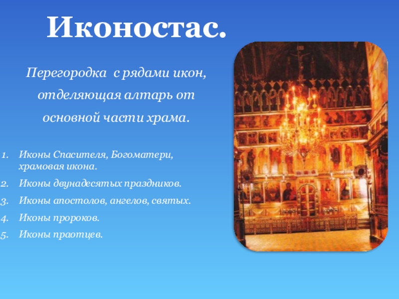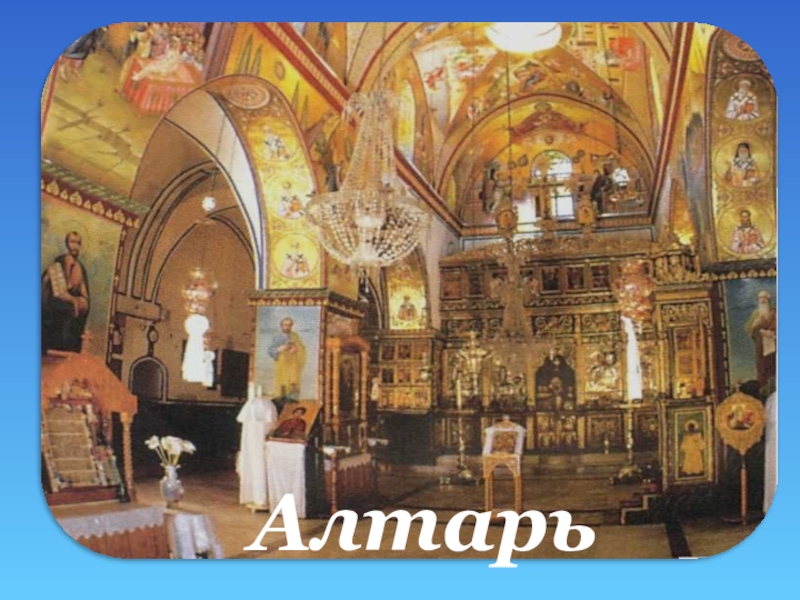 Алтарь - важнейшая часть христианского храма, расположен в восточной части храма и отгорожен от центральной части алтарной перегородкой или иконостасом