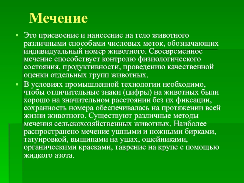 меток, обозначающих индивидуальный номер животного. Своевременное мечение способствует контролю физиологического состояния, продуктивности, проведению качественной оценки отдельных групп животных.
