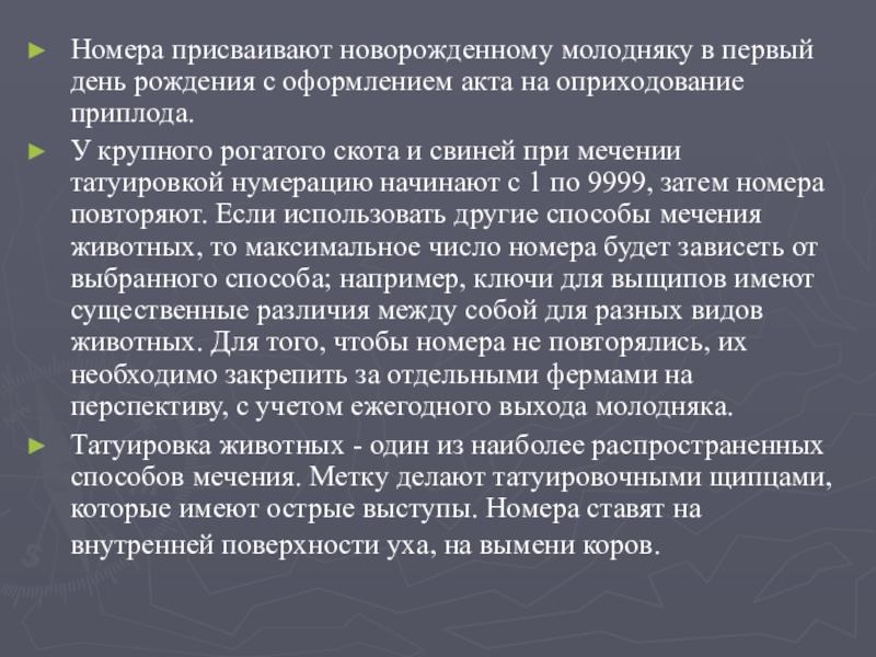 Слайд 4Номера присваивают новорожденному молодняку в первый день рождения с оформлением акта