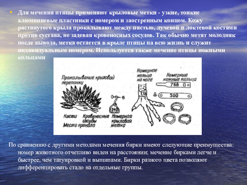 Слайд 9Для мечения птицы применяют крыловые метки - узкие, тонкие алюминиевые пластинки