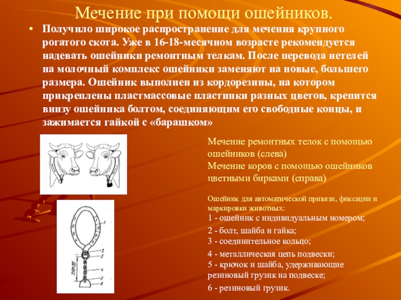 скота. Уже в 16-18-месячном возрасте рекомендуется надевать ошейники ремонтным телкам. После перевода нетелей на молочный комплекс ошейники заменяют на новые, большего размера. Ошейник выполнен из кордорезины, на котором прикреплены пластмассовые пластинки разных цветов, крепится внизу ошейника болтом, соединяющим его свободные концы, и зажимается гайкой с «барашком»