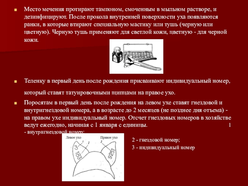 Татуировка животных - один из наиболее распространенных способов мечения. Метку делают татуировочными щипцами, которые имеют острые выступы. Номера ставят на внутренней поверхности уха, на вымени коров.
