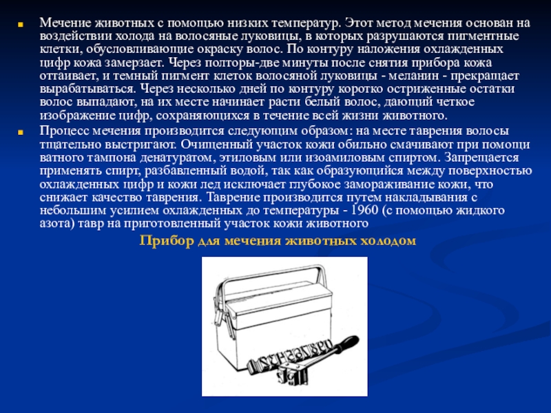 Слайд 11Мечение животных с помощью низких температур. Этот метод мечения основан на