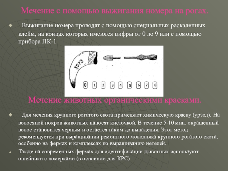Слайд 12Мечение с помощью выжигания номера на рогах.