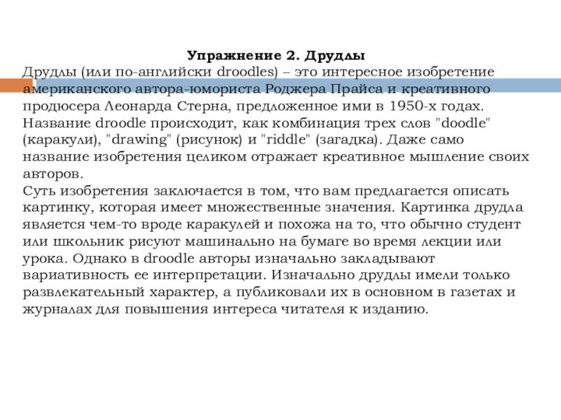 Упражнение 2. ДрудлыДрудлы (или по-английски droodles) – это интересное изобретение американского автора-юмориста Роджера Прайса и креативного продюсера