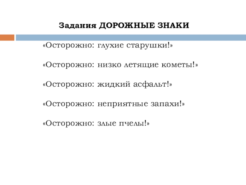 Задания ДОРОЖНЫЕ ЗНАКИ «Осторожно: глухие старушки!» «Осторожно: низко летящие кометы!» «Осторожно: жидкий асфальт!» «Осторожно: неприятные запахи!» «Осторожно: злые пчелы!»
