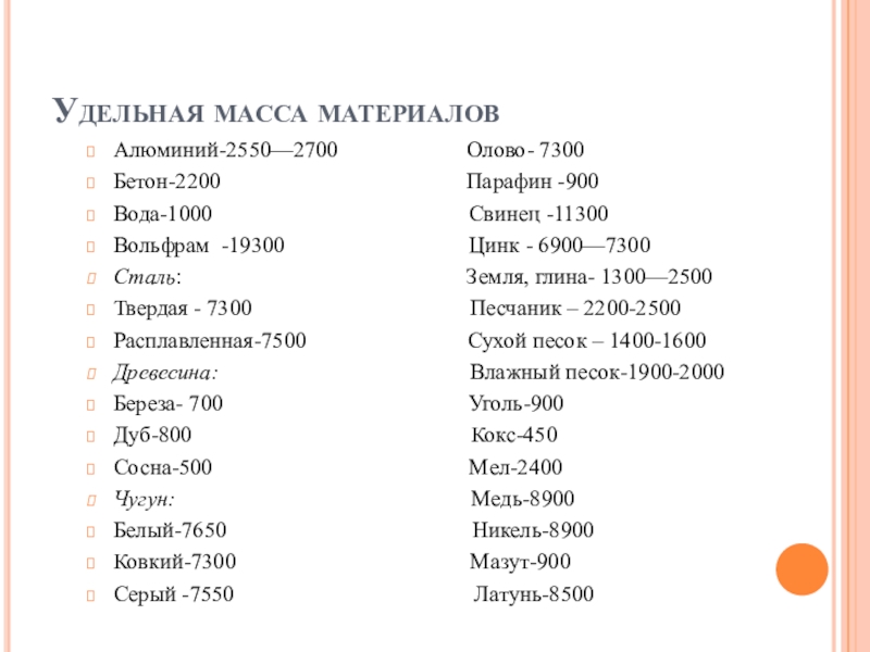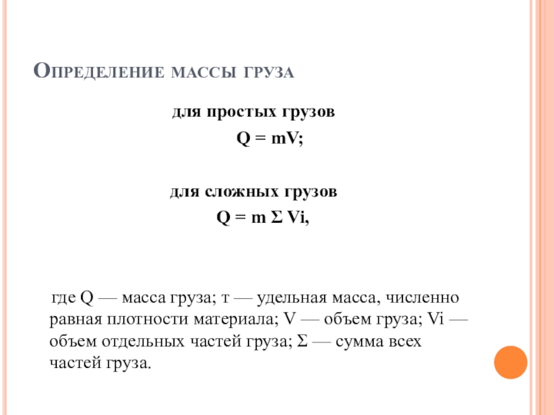 где Q — масса груза; т — удельная масса, численно равная плотности материала; V — объем груза; Vi — объем отдельных частей груза; Σ — сумма всех частей груза.