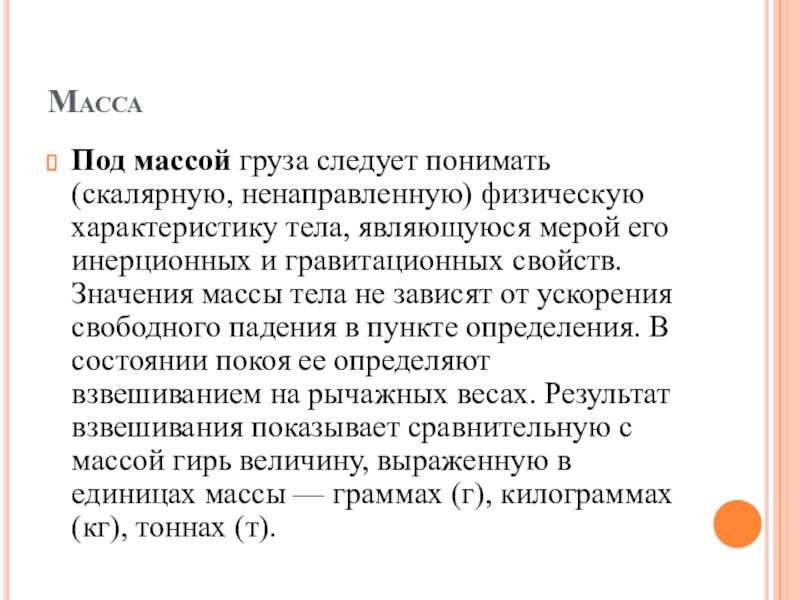 мерой его инерционных и гравитационных свойств. Значения массы тела не зависят от ускорения свободного падения в пункте определения. В состоянии покоя ее определяют взвешиванием на рычажных весах. Результат взвешивания показывает сравнительную с массой гирь величину, выраженную в единицах массы — граммах (г), килограммах (кг), тоннах (т).