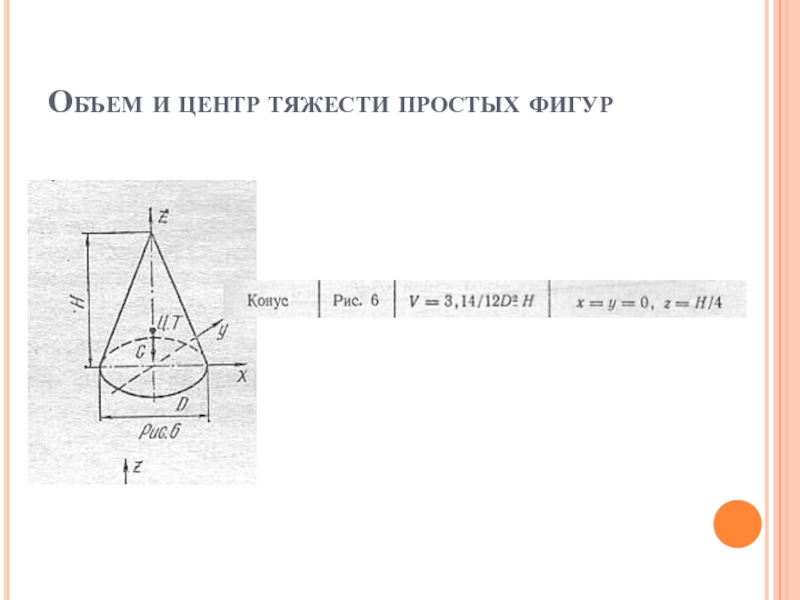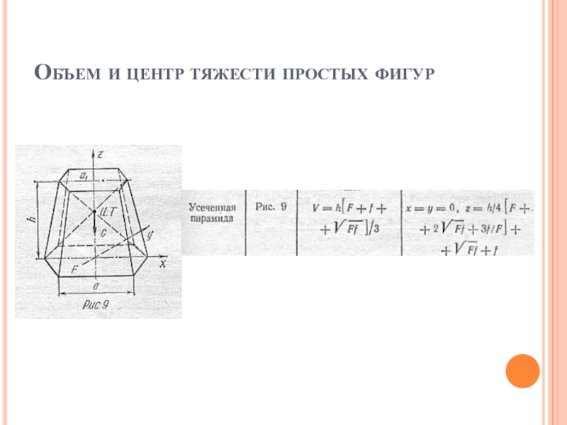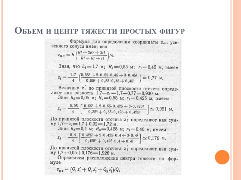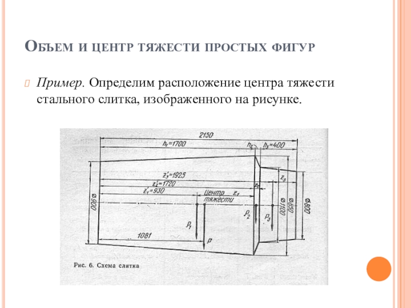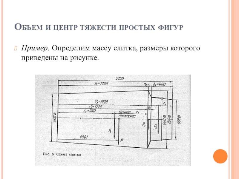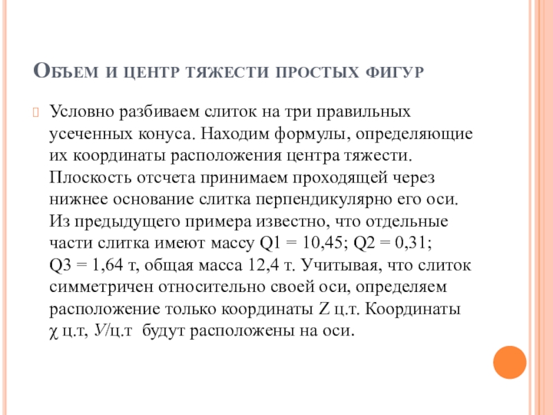усеченных конуса. Находим формулы, определяющие их координаты расположения центра тяжести. Плоскость отсчета принимаем проходящей через нижнее основание слитка перпендикулярно его оси. Из предыдущего примера известно, что отдельные части слитка имеют массу Q1 = 10,45; Q2 = 0,31; Q3 = 1,64 т, общая масса 12,4 т. Учитывая, что слиток симметричен относительно своей оси, определяем расположение только координаты Z ц.т. Координаты χ ц.т, У/ц.т будут расположены на оси.