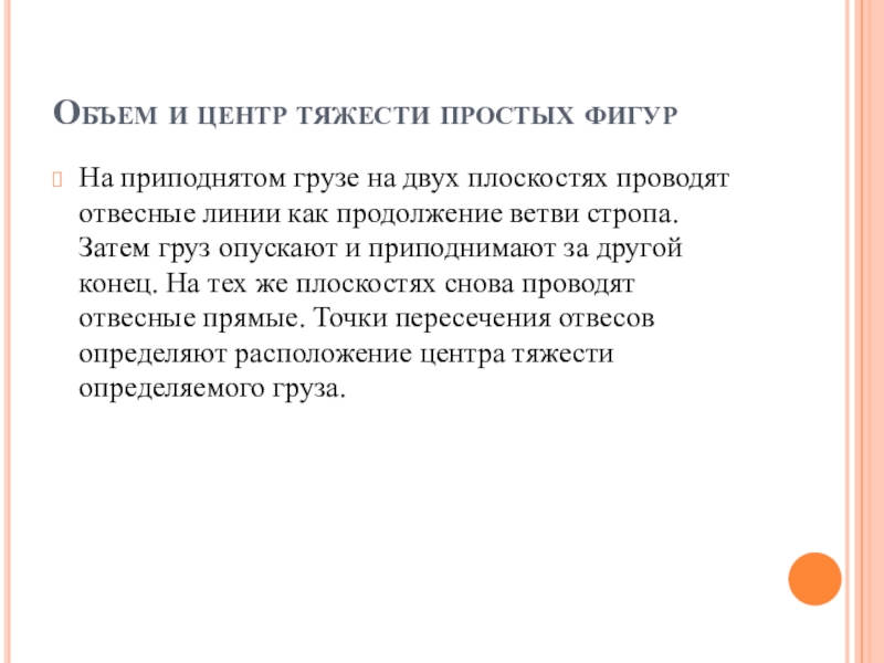 проводят отвесные линии как продолжение ветви стропа. Затем груз опускают и приподнимают за другой конец. На тех же плоскостях снова проводят отвесные прямые. Точки пересечения отвесов определяют расположение центра тяжести определяемого груза.