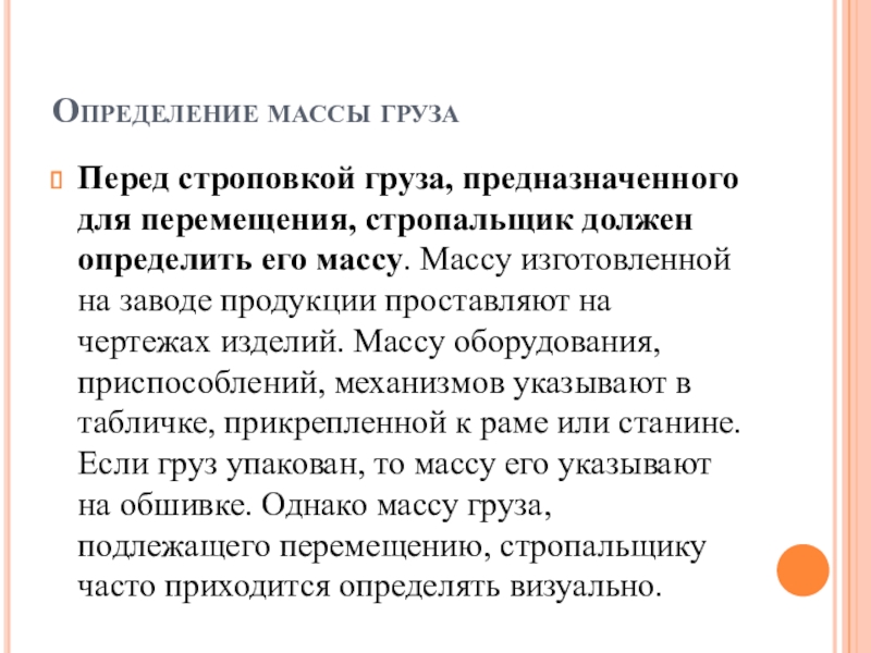 его массу. Массу изготовленной на заводе продукции проставляют на чертежах изделий. Массу оборудования, приспособлений, механизмов указывают в табличке, прикрепленной к раме или станине. Если груз упакован, то массу его указывают на обшивке. Однако массу груза, подлежащего перемещению, стропальщику часто приходится определять визуально.