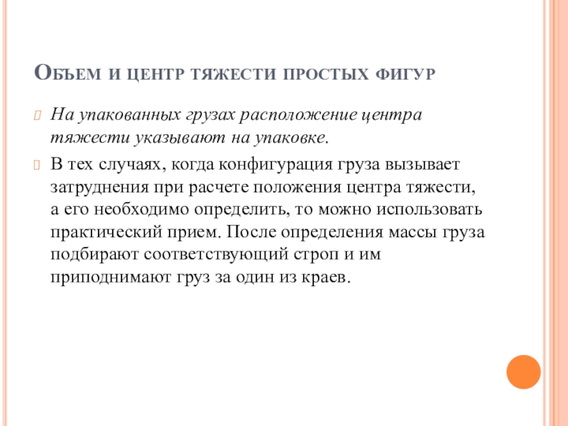 В тех случаях, когда конфигурация груза вызывает затруднения при расчете положения центра тяжести, а его необходимо определить, то можно использовать практический прием. После определения массы груза подбирают соответствующий строп и им приподнимают груз за один из краев.