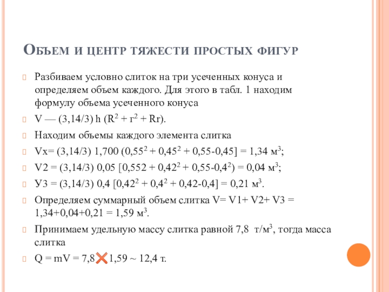 Определяем суммарный объем слитка V= V1+ V2+ V3 = 1,34+0,04+0,21 = 1,59 м3.