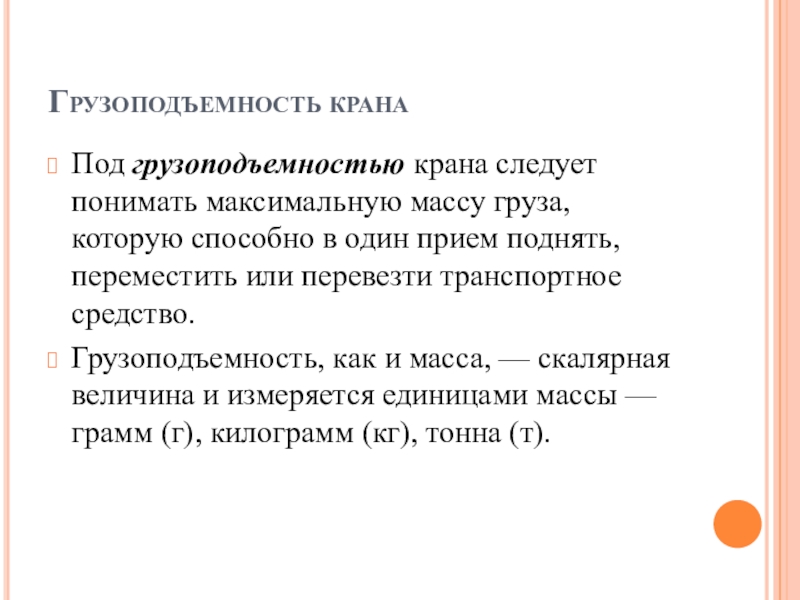 Грузоподъемность, как и масса, — скалярная величина и измеряется единицами массы — грамм (г), килограмм (кг), тонна (т).