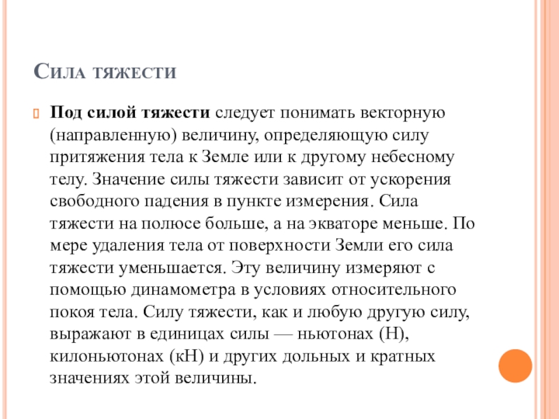 притяжения тела к Земле или к другому небесному телу. Значение силы тяжести зависит от ускорения свободного падения в пункте измерения. Сила тяжести на полюсе больше, а на экваторе меньше. По мере удаления тела от поверхности Земли его сила тяжести уменьшается. Эту величину измеряют с помощью динамометра в условиях относительного покоя тела. Силу тяжести, как и любую другую силу, выражают в единицах силы — ньютонах (Н), килоньютонах (кН) и других дольных и кратных значениях этой величины.