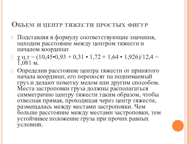 Определив расстояние центра тяжести от принятого начала координат, его переносят на поднимаемый груз и делают пометку мелом или другим способом. Места застроповки груза должны располагаться симметрично центру тяжести таким образом, чтобы отвесная прямая, проходящая через центр тяжести, размещалась между местами застроповки. Чем больше расстояние между местами застроповки, тем устойчивее положение груза при прочих равных условиях.