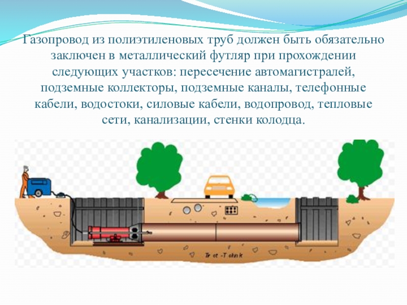 Слайд 8Газопровод из полиэтиленовых труб должен быть обязательно заключен в металлический футляр