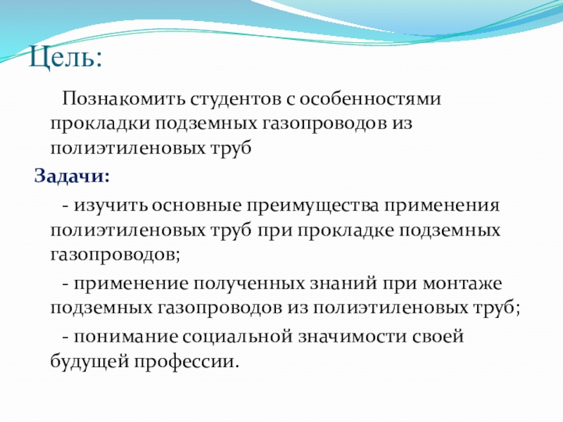 Познакомить студентов с особенностями прокладки подземных газопроводов из полиэтиленовых труб