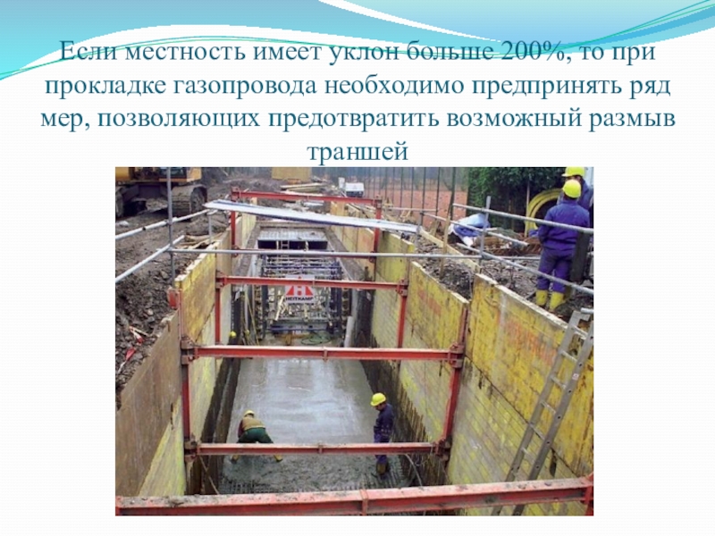 Слайд 6Если местность имеет уклон больше 200%, то при прокладке газопровода необходимо