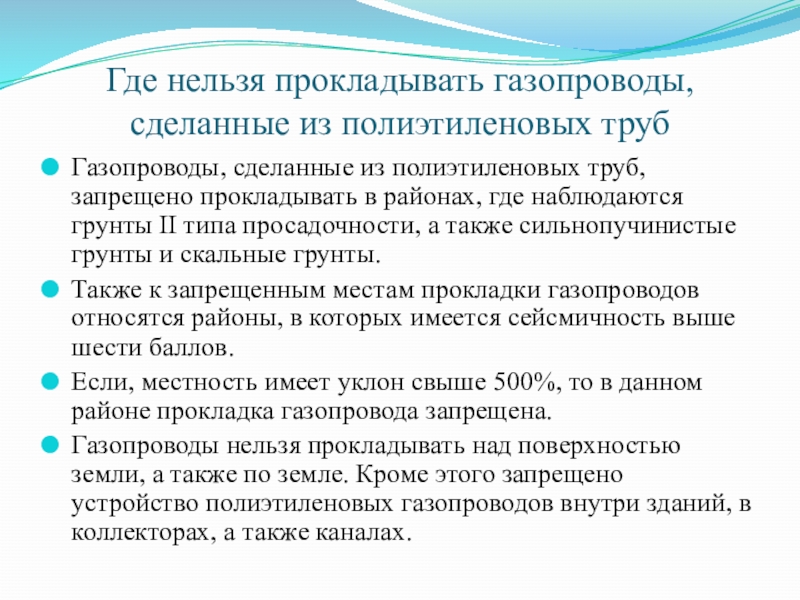 Слайд 5Где нельзя прокладывать газопроводы, сделанные из полиэтиленовых труб