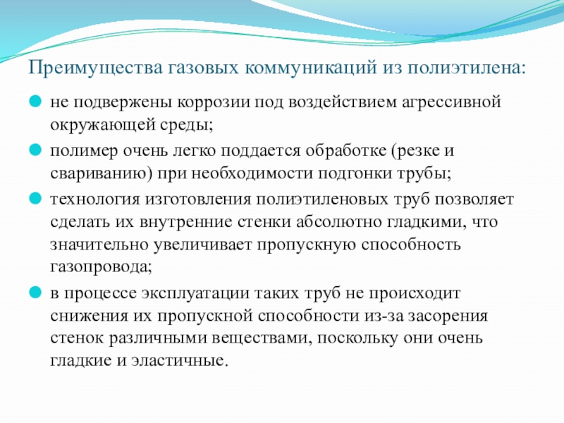 Слайд 16Преимущества газовых коммуникаций из полиэтилена: