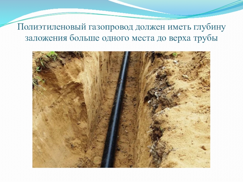 Слайд 7Полиэтиленовый газопровод должен иметь глубину заложения больше одного места до верха