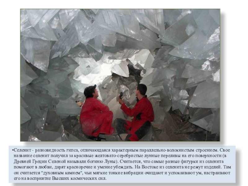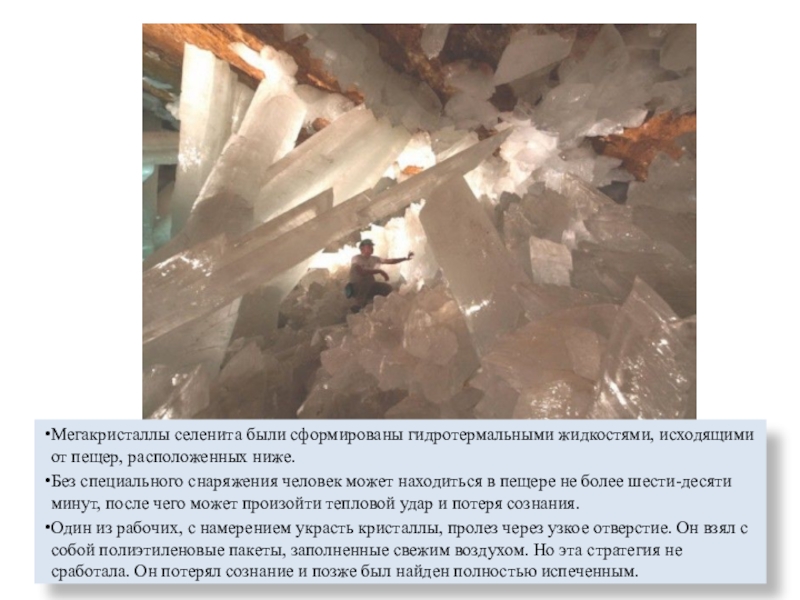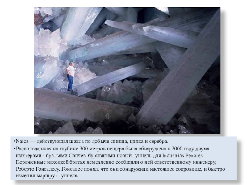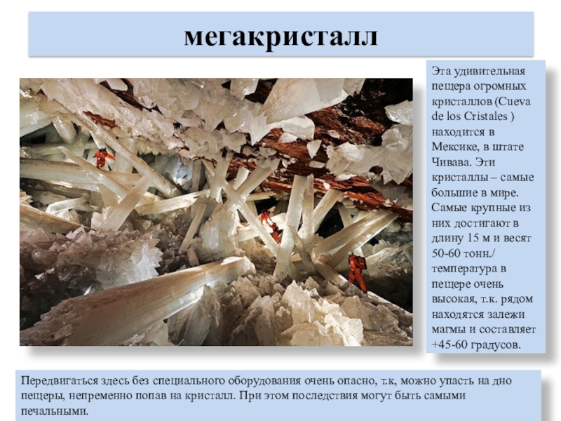 Эта удивительная пещера огромных кристаллов (Cueva de los Cristales ) находится в Мексике, в штате Чивава. Эти кристаллы – самые большие в мире. Самые крупные из них достигают в длину 15 м и весят 50-60 тонн./ температура в пещере очень высокая, т.к. рядом находятся залежи магмы и составляет +45-60 градусов.