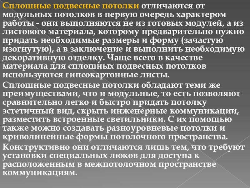 Слайд 9Сплошные подвесные потолки отличаются от модульных потолков в первую очередь характером