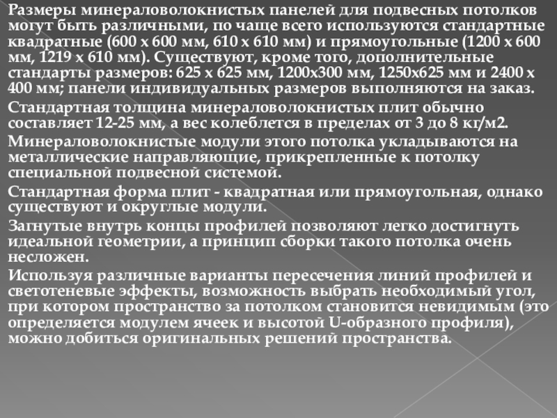 Слайд 15Размеры минераловолокнистых панелей для подвесных потолков могут быть различными, по чаще