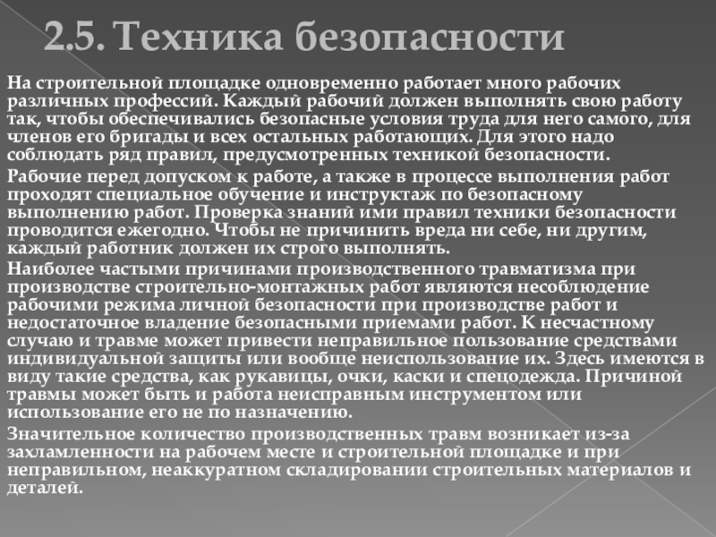 В условиях современной строительной площадки - при большой насыщенности ее строительными машинами и механизмами и одновременном производстве работ многими субподрядными организациями - строгое соблюдение требований техники безопасности не может быть обеспечено только инженерно-техническими работниками и работниками службы охраны труда. Личная и коллективная безопасность работающих может быть обеспечена только при правильном отношении к требованиям охраны труда всех членов коллектива.