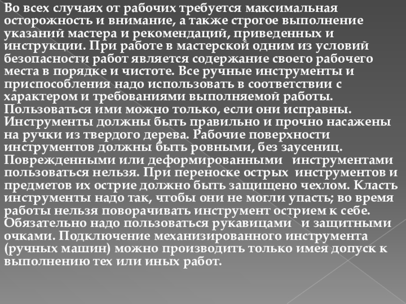 также строгое выполнение указаний мастера и рекомендаций, приведенных и инструкции. При работе в мастерской одним из условий безопасности работ является содержание своего рабочего места в порядке и чистоте. Все ручные инструменты и приспособления надо использовать в соответствии с характером и требованиями выполняемой работы. Пользоваться ими можно только, если они исправны. Инструменты должны быть правильно и прочно насажены на ручки из твердого дерева. Рабочие поверхности инструментов должны быть ровными, без заусениц. Поврежденными или деформированными инструментами пользоваться нельзя. При переноске острых инструментов и предметов их острие должно быть защищено чехлом. Класть инструменты надо так, чтобы они не могли упасть; во время работы нельзя поворачивать инструмент острием к себе. Обязательно надо пользоваться рукавицами и защитными очками. Подключение механизированного инструмента (ручных машин) можно производить только имея допуск к выполнению тех или иных работ.