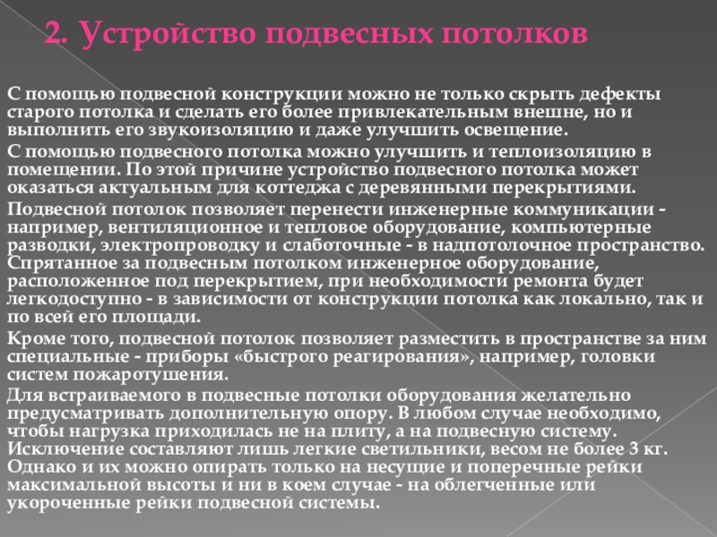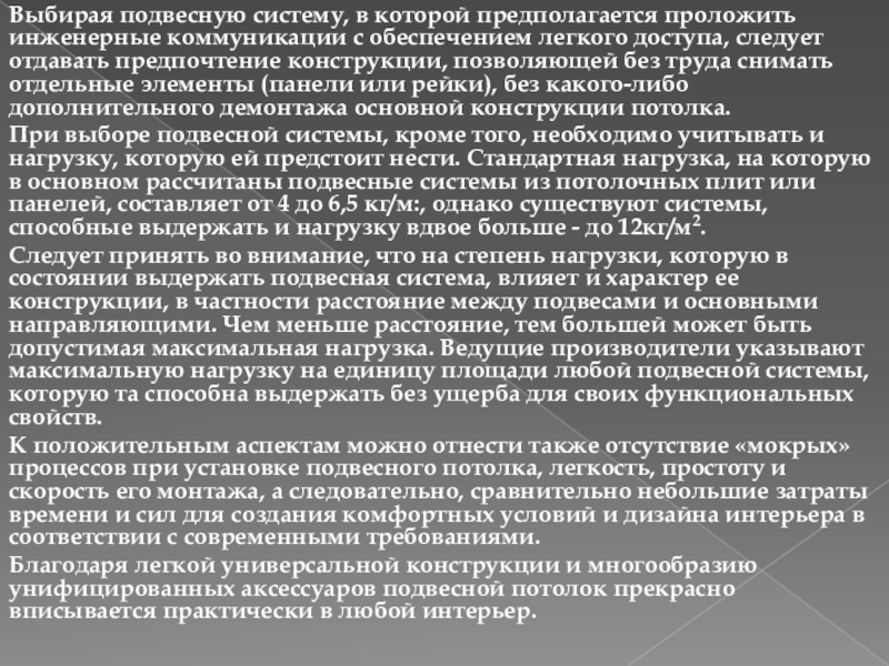 Слайд 5Выбирая подвесную систему, в которой предполагается проложить инженерные коммуникации с обеспечением