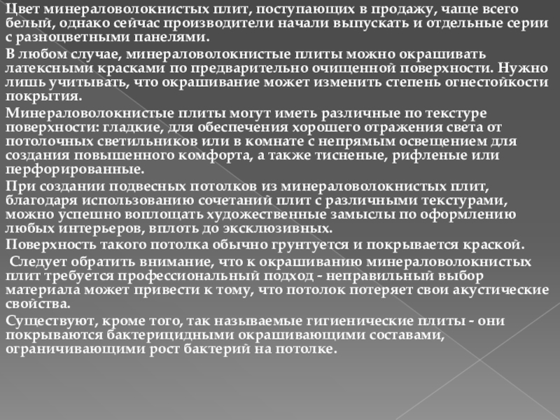 Слайд 14Цвет минераловолокнистых плит, поступающих в продажу, чаще всего белый, однако сейчас