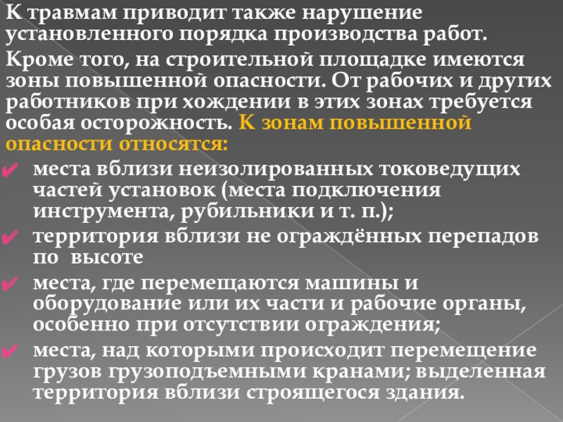 строительной площадке имеются зоны повышенной опасности. От рабочих и других работников при хождении в этих зонах требуется особая осторожность. К зонам повышенной опасности относятся: