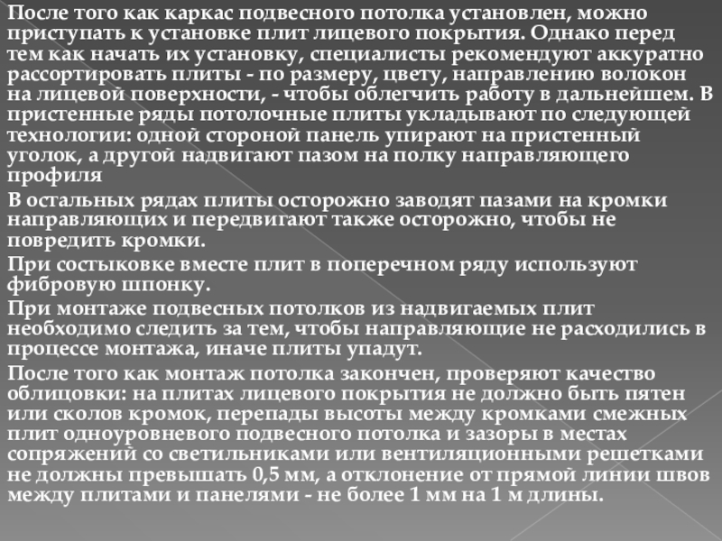 плит лицевого покрытия. Однако перед тем как начать их установку, специалисты рекомендуют аккуратно рассортировать плиты - по размеру, цвету, направлению волокон на лицевой поверхности, - чтобы облегчить работу в дальнейшем. В пристенные ряды потолочные плиты укладывают по следующей технологии: одной стороной панель упирают на пристенный уголок, а другой надвигают пазом на полку направляющего профиля