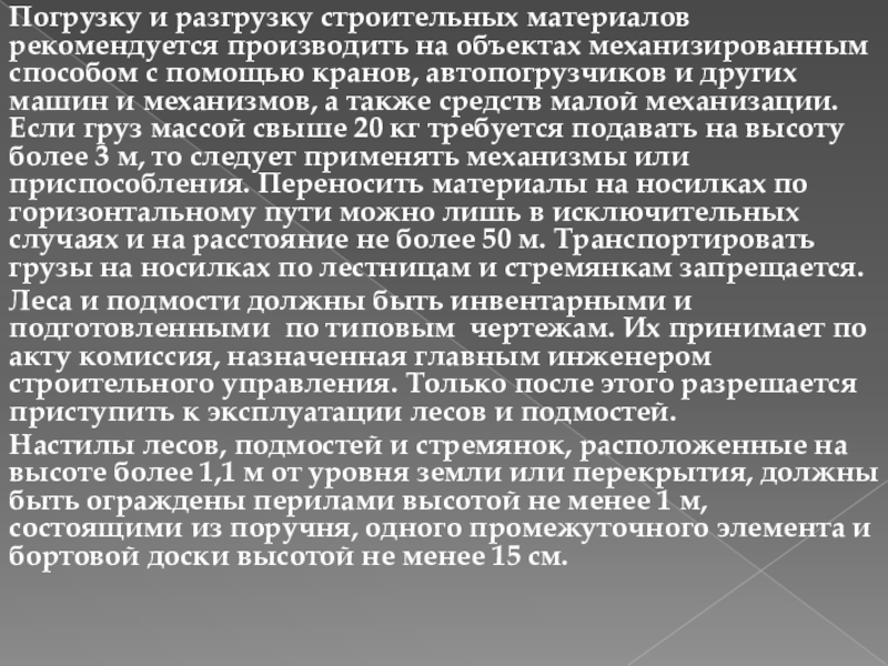 Слайд 26Погрузку и разгрузку строительных материалов рекомендуется производить на объектах механизированным способом