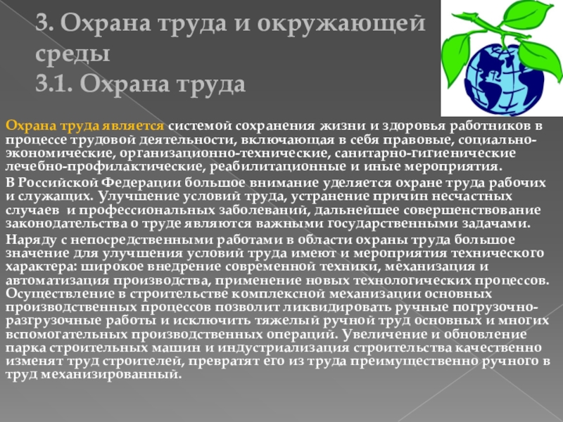 Наряду с непосредственными работами в области охраны труда большое значение для улучшения условий труда имеют и мероприятия технического характера: широкое внедрение современной техники, механизация и автоматизация производства, применение новых технологических процессов. Осуществление в строительстве комплексной механизации основных производственных процессов позволит ликвидировать ручные погрузочно-разгрузочные работы и исключить тяжелый ручной труд основных и многих вспомогательных производственных операций. Увеличение и обновление парка строительных машин и индустриализация строительства качественно изменят труд строителей, превратят его из труда преимущественно ручного в труд механизированный.
